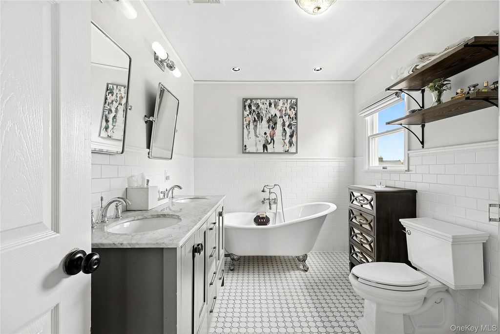Beautifully updated Colonial offering a modern open layout, warm finishes, and every comfort for today's lifestyle. The living room features a gas fireplace and opens to an updated kitchen with 11 foot ceilings, custom cabinetry, stainless steel appliances, and quartz countertops that complement the home's timeless appeal. A convenient powder room completes the main level. Hardwood floors extend throughout, creating a sense of continuity and warmth. The second level includes a primary bedroom with its own bath, plus two additional bedrooms and a full bath. The lower level offers a full basement with a partially finished area ideal for recreation, office, or gym, along with a laundry area and additional storage. Enjoy a private backyard with a patio ideal for outdoor dining and relaxation. Additional highlights include central air conditioning, gas heat, Nest thermostats, a smartphone-enabled alarm system, a brand-new roof, new hot water heater, private driveway, and a 2.5-car detached heated garage. Located in the heart of Port Washington, close to parks, shopping, dining, and just minutes to the LIRR, this home blends modern updates with the warmth and character that define the North Shore.