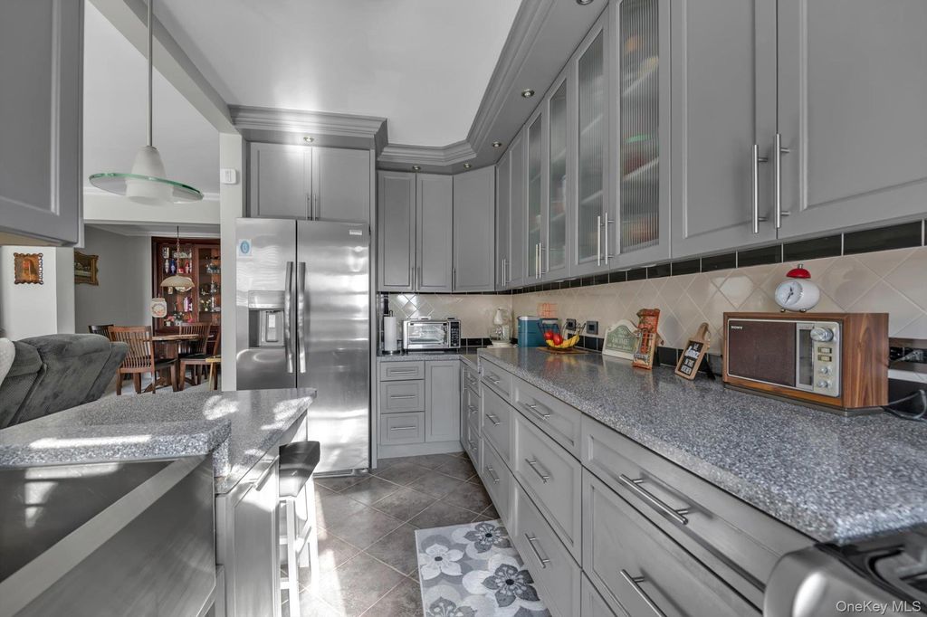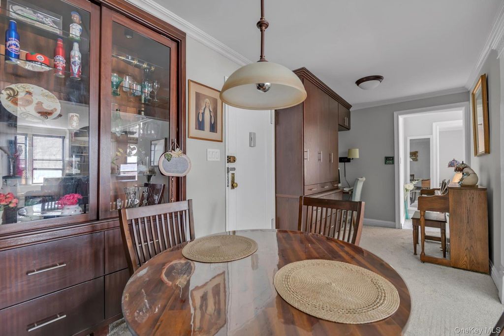 Welcome to this beautifully designed two-bedroom, one-bath corner residence that seamlessly blends style, comfort, and exceptional storage throughout. A truly special home that combines thoughtful design, exceptional storage, and a prime location From the moment you enter, you are greeted by a striking in-wall glass display cabinet with additional lower storage, creating both a functional and elegant first impression. A dedicated dining area comfortably seats four to six, perfectly positioned beside a large built-in storage unit and a thoughtfully designed workstation ideal for working or studying from home. The open living area flows effortlessly from the dining space and features custom built-in shelving, a cozy reading nook, and refined crown molding that runs throughout the apartment, adding timeless charm and character. The kitchen is both beautiful and highly functional, offering abundant cabinetry, recessed lighting, under-cabinet illumination, a deep sink, and convenient pot drawers with generous counterspace - designed for anyone who enjoys cooking and entertaining. The spacious bathroom has separated his-and-her areas, a rare and highly desirable feature. The primary bedroom easily accommodates a king-size bed and offers custom-built his-and-her closets, recessed dimmable lighting, and a serene atmosphere perfect for relaxing. The second bedroom is equally versatile, ideal for a guest room, home office, or media room, and includes its own custom closet. A standout bonus is the expansive walk-in storage closet located along the exterior wall - perfect for utilities, seasonal items, and everything you want neatly tucked away. This corner unit enjoys abundant natural light and an unbeatable location near buses and the train. Directly across from Woodhaven's scenic parkland, residents have easy access to trails, running paths, and a nearby golf course - offering a rare blend of city convenience and outdoor living.